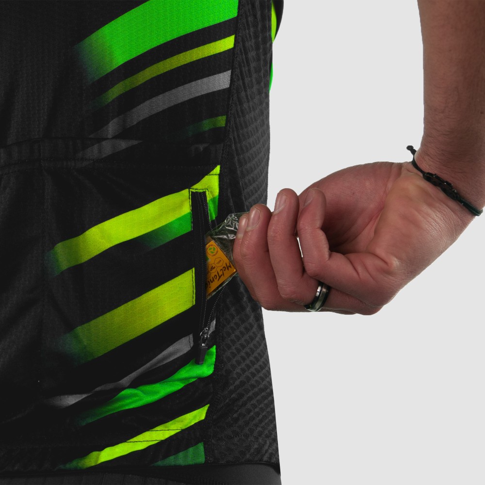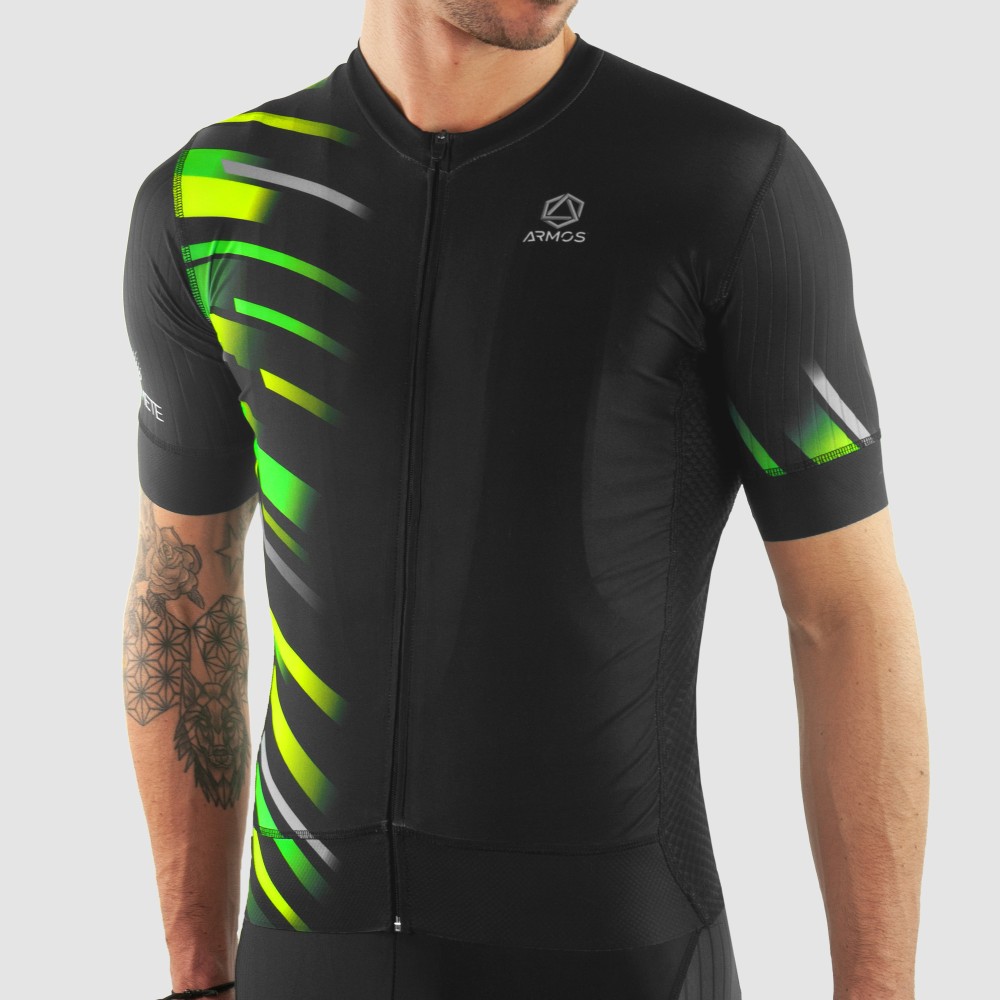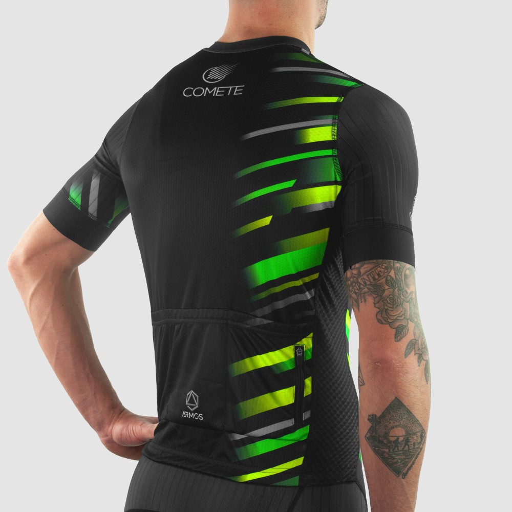 Designed for performance, this superb ARMOS COMET jersey has a fitted cut close to the body and aerodynamic fabrics. With an intelligent position of ventilated fabrics, you can ride in summer and spring with temperatures between 20 and 30 degrees. With 4 pockets and flat anti-friction seams, this quality ELITE jersey will allow you to put on the kilometers on road.