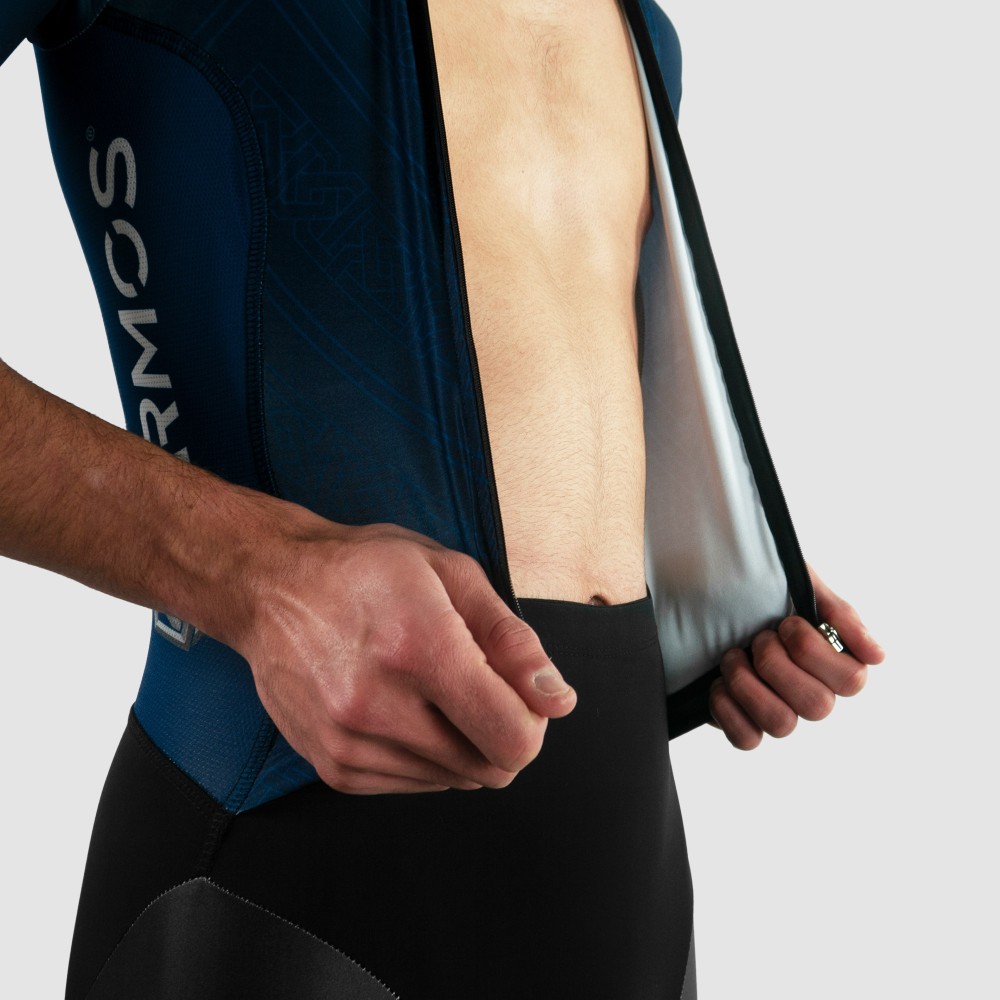 Coupe anatomique préformée; lycra light sur l'avant; Zip avant avec fermoir auto bloquant et protégé; Tissu micro perforé sur les flancs.