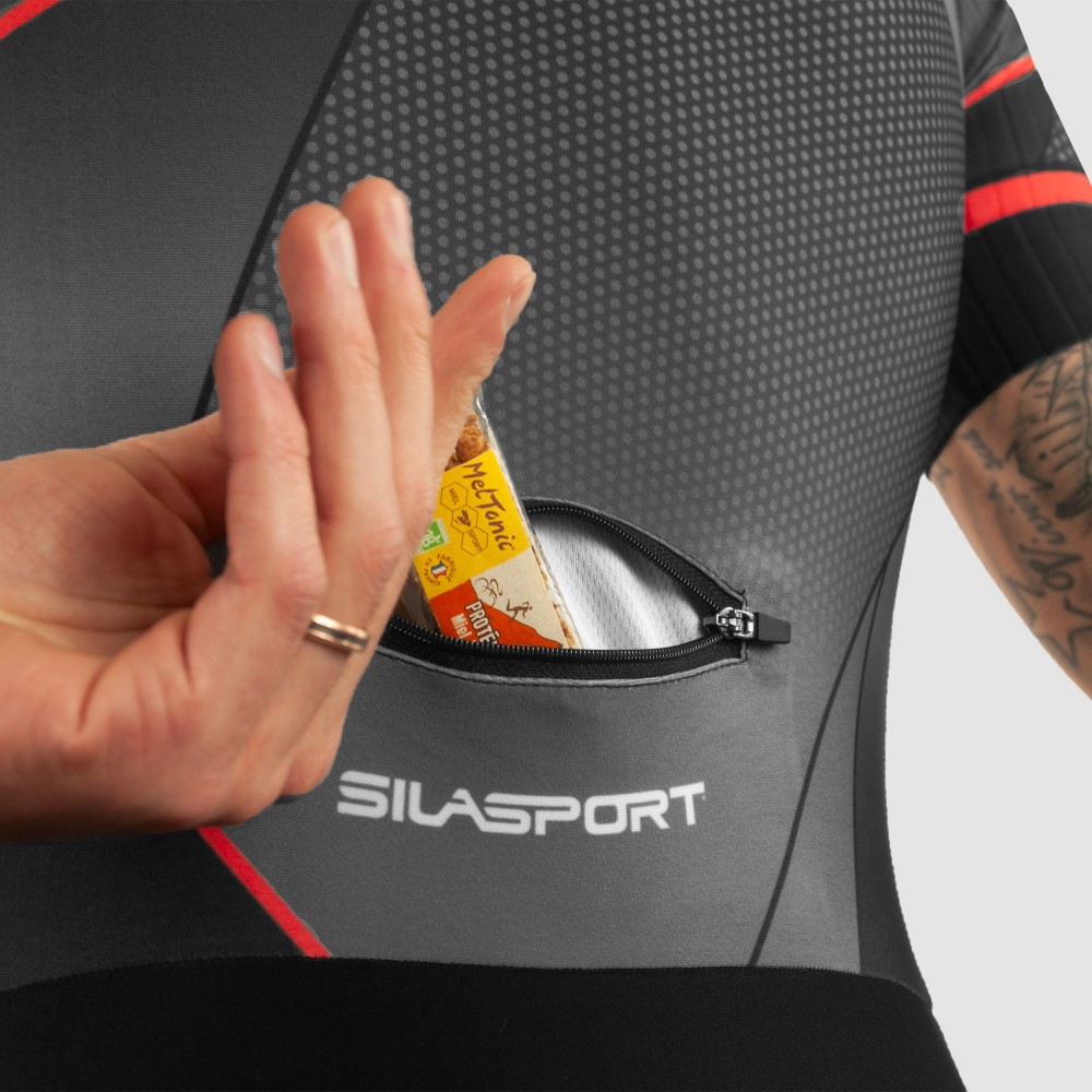 SILASPORT a créé cette trifonction avec un design original et visible. Grâce à sa coupe et ses tissus, ce produit est spécialement adapté pour les courtes distances. Il possède des bandes grip aux cuisses pour un ajustement parfait. Son zip avant et ses coutures plates rendent ce produit plus confortable afin de pouvoir l’utiliser jusqu’à la distance M.