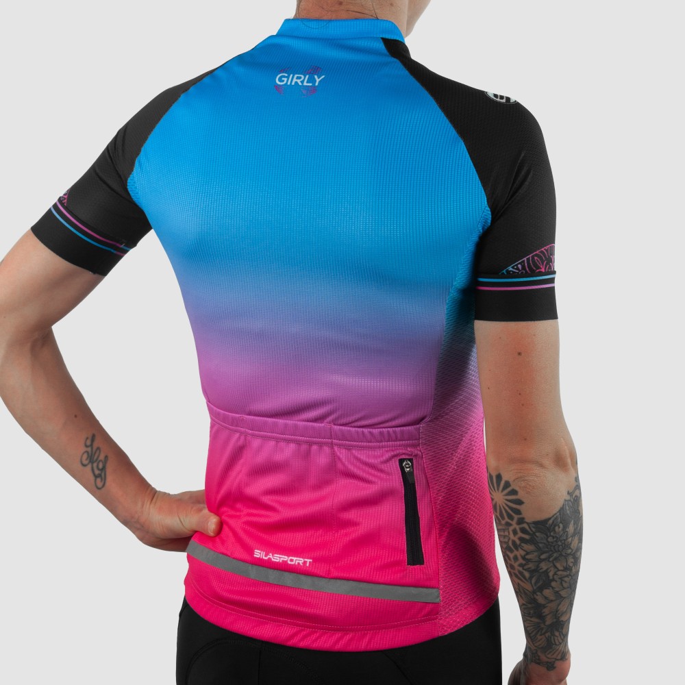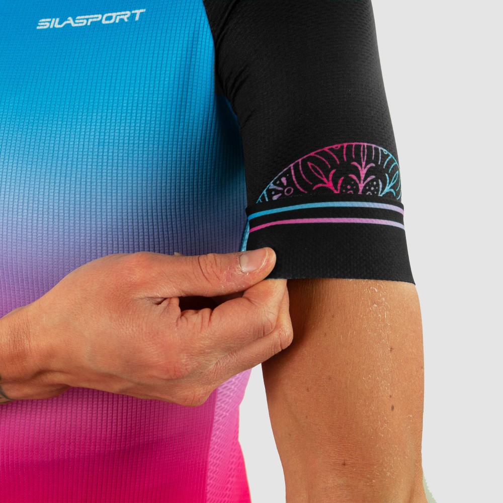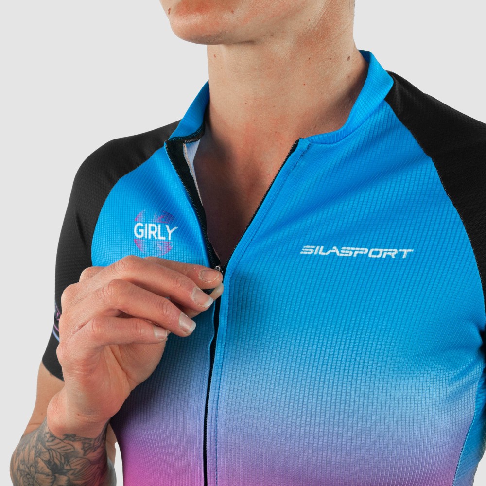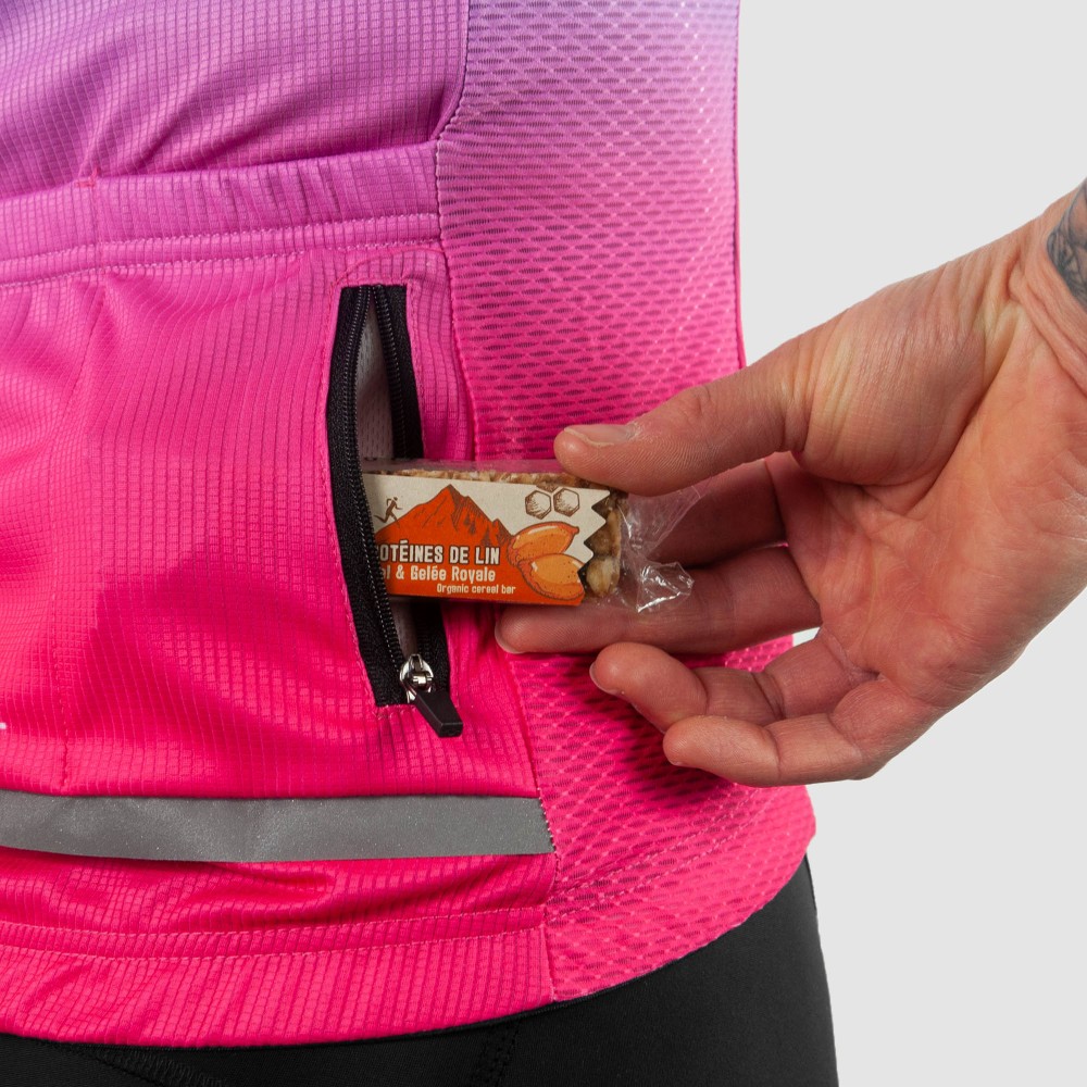 L’équipe SILASPORT a travaillé sur une coupe de maillot à la fois performante et pleine de féminité. En effet, ce produit est bien ajusté afin de limiter la prise au vent. Les manches sont courtes pour une plus grande liberté de mouvement et un effet Girly. Ce maillot femme sera parfait pour vos sorties de l’été entre 20 et 30 degrés. Laissez-vous tenter par ce maillot avec ce dégradé très tendance et très féminin.